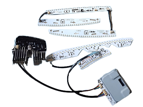 Covering multiple LED modules and sub-assemblies, including but not limited to: headlamp lens modules, high/low beam lights, daytime running lights, position lamps, turn signal lights, front signature light bars, front fog lights and cornering lamps.