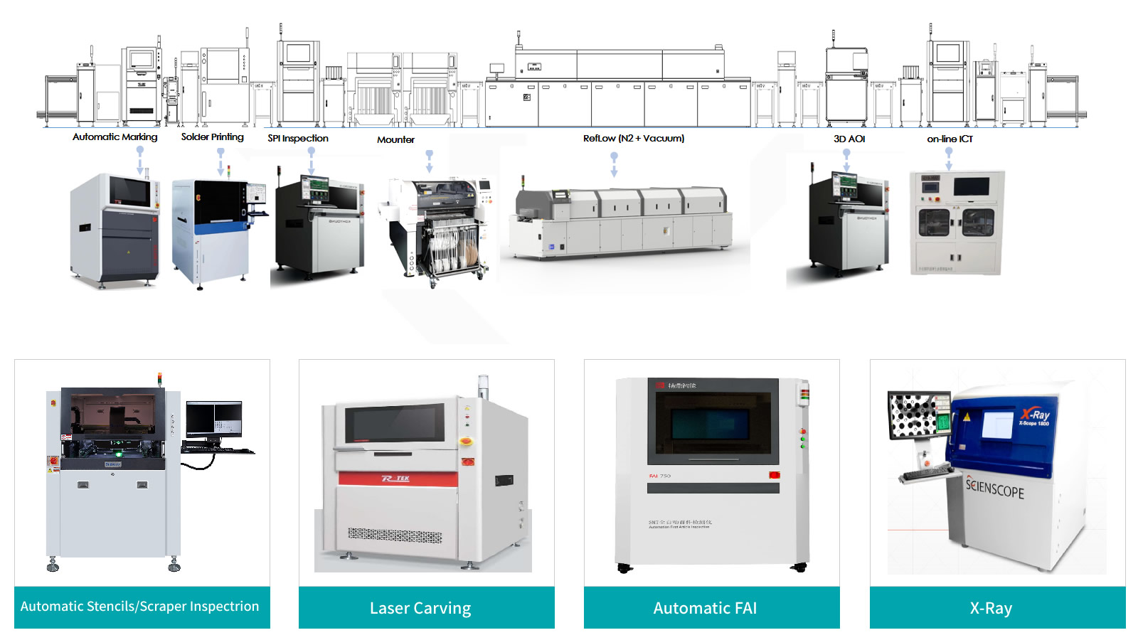 Auto laser engraver, automatic marking, PCB auto-loader, auto-dust cleaning, fully automated stencil printing, in-line SPI, high-speed chip mounters, universal chip mounters, reflow soldering(nitrogen + vacuum), 2D/ 3D AOI, on-line ICT, X-RAY inspection, etc.