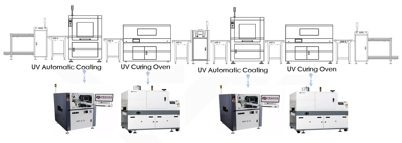 Double-sided coating line:automatic coating, UV curing, automatic panel flipping, automatic coating(reverse side), UV curing(reverse side)