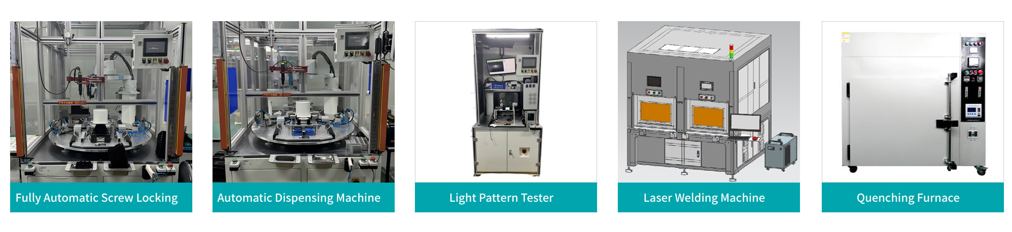 Automated dispensing, automatd screw locking, auto-light pattern tester, laser welding, quenching furnace, etc.